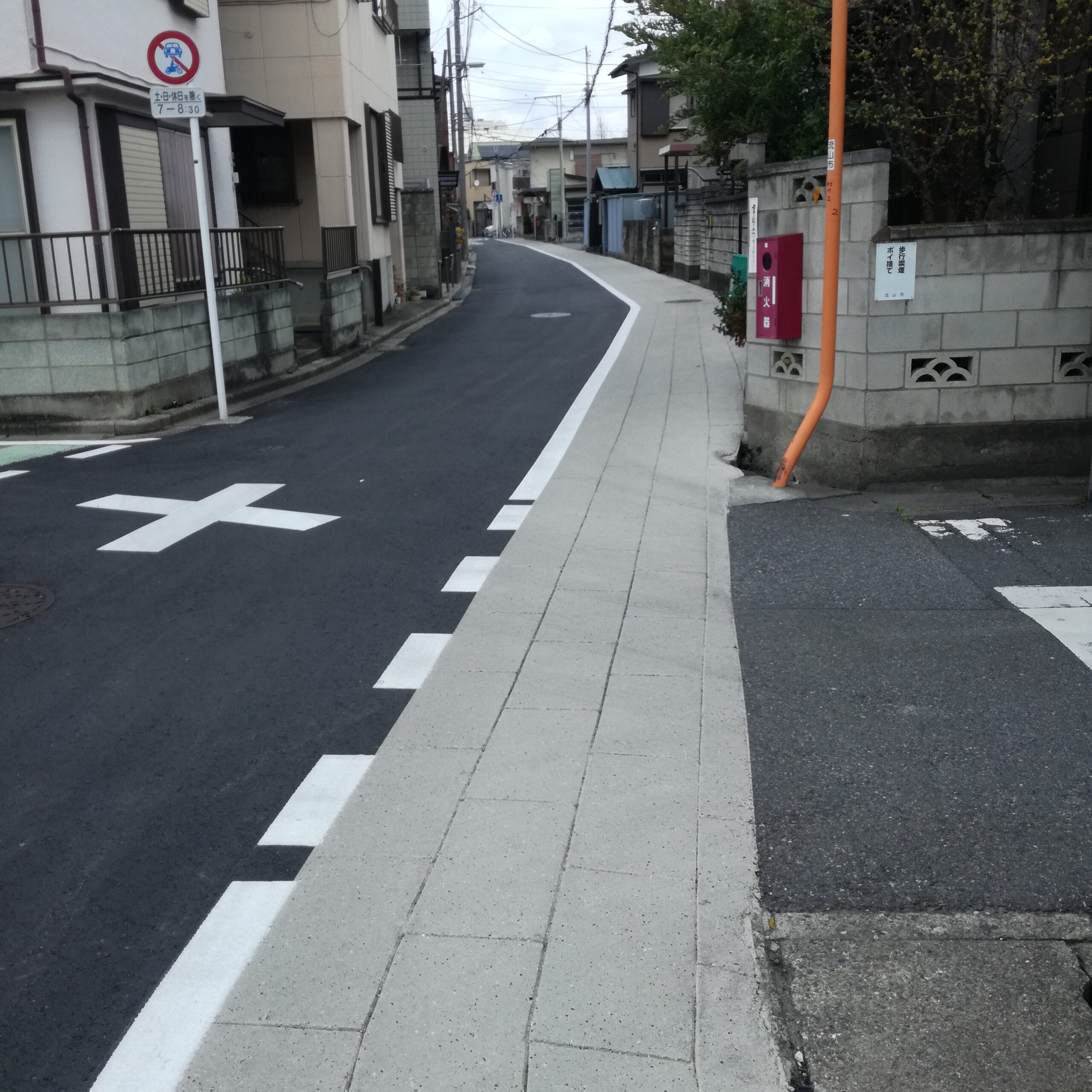 車道に仕切りの線とインターロッキングで