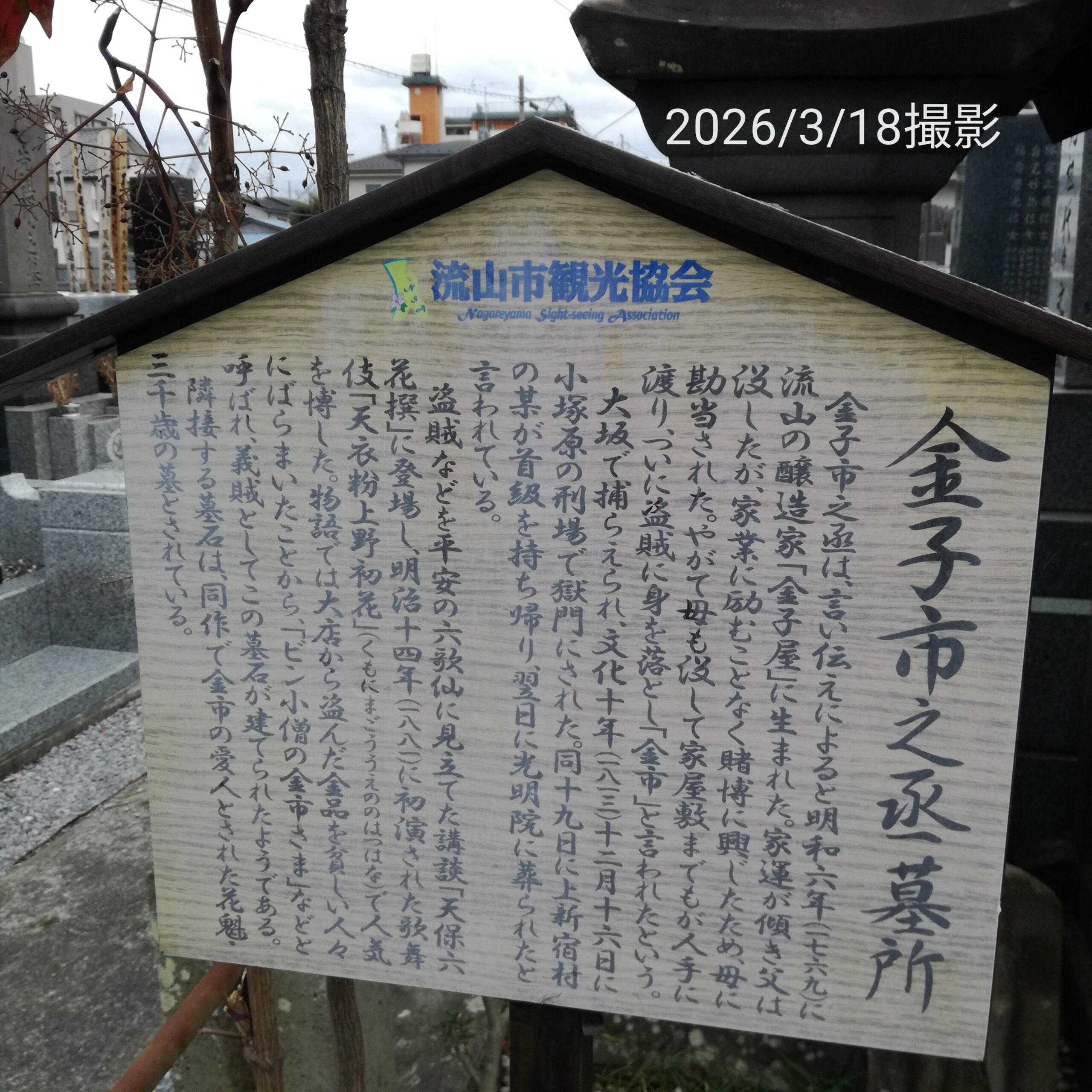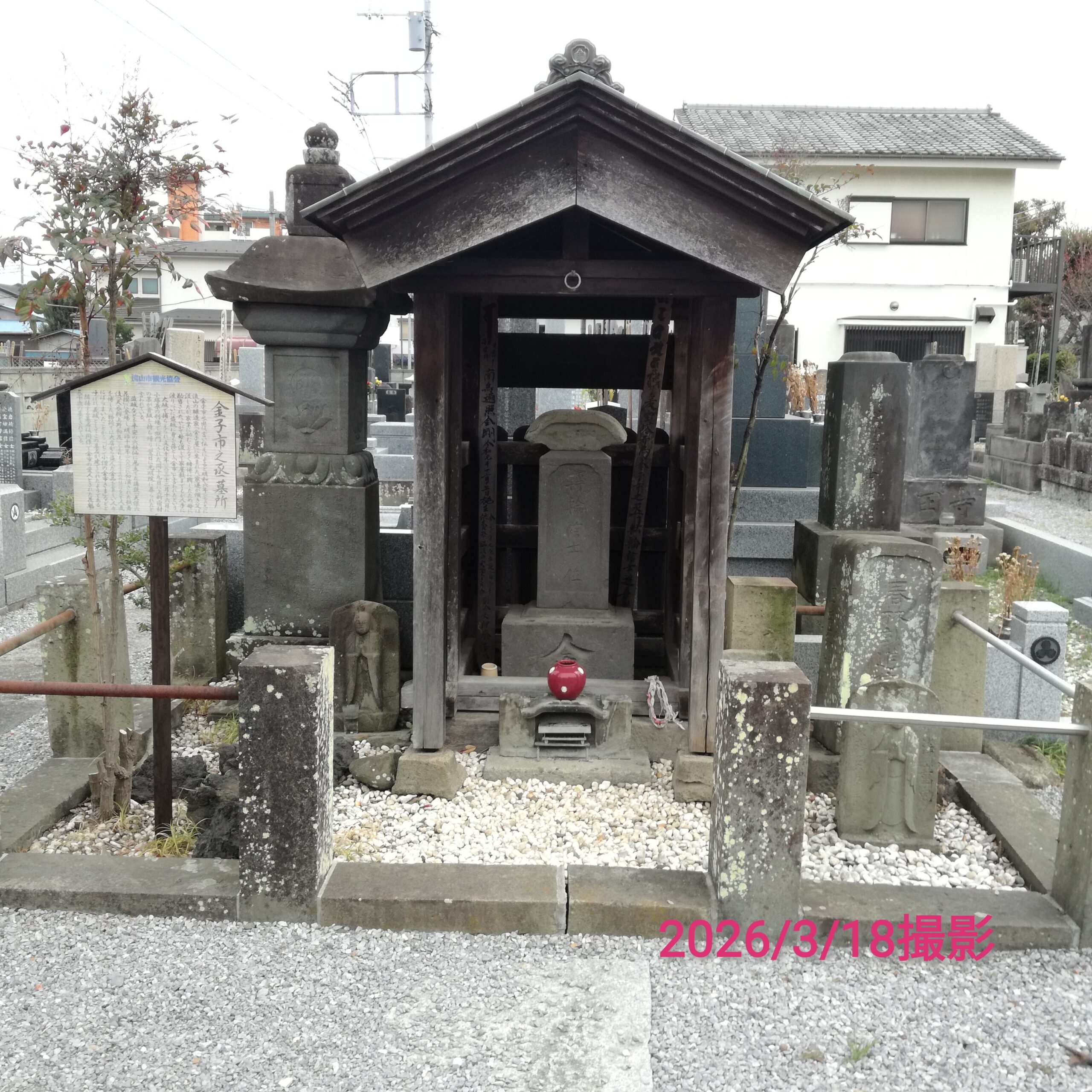 「ピン小僧の金市さま」などと呼ばれ、義賊としてこの墓石が建てられたようである。隣接する墓石は、同作で金市の愛人とされた花魁・」三千歳の墓とされている。 案内板 参照